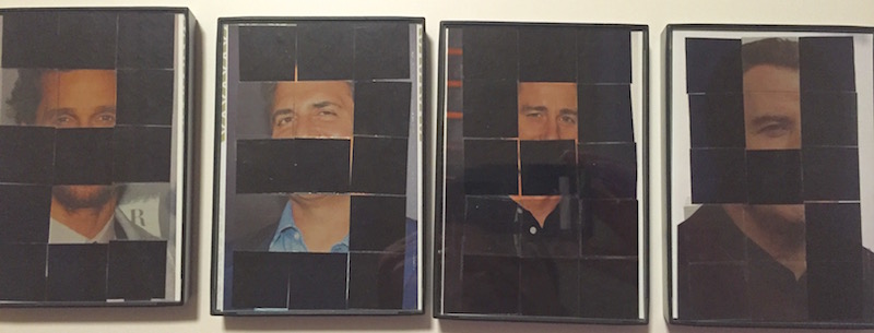 Four photographs of celebrities with transparent tiles over their faces. Some of the tiles are opaque in the shape of numbers.