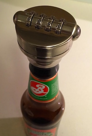 With the correct code in place, it inserts into the mouth of a bottle like a cork or stopper. Then you start twisting the top of the lock. In doing so, it slowly expands the stopper until it fills the mouth of the bottle and cannot be removed without unwinding it.