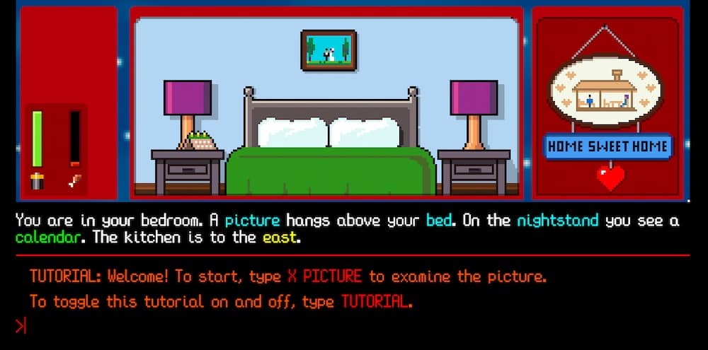 This is a narrative- and character-focused text adventure game with supplemental pixel art.