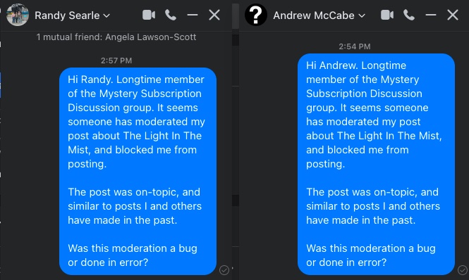 After sending these, I spoke to a few more people who all had the same experience. They posted about The Light in the Mist on the Mystery Subscription Discussion, and their content was moderated away.