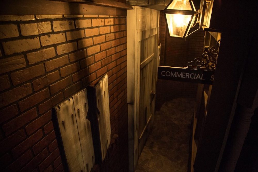 Murder in London transported us back in time to the gloomy streets of historic London. The set included an iconic red telephone booth, and a narrow street wrapped around a central British pub. Various other houses and storefronts lined the way.