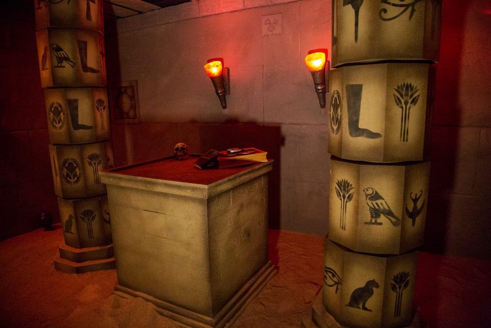 Secrets of the Pharaohs took us to an ancient Egyptian tomb. The set was solidly built and felt like a quintessential Egyptian escape room: torches lined the walls, two large pillars surrounded a central pedestal, and hieroglyphs covered many surfaces of the room. In addition, the floor was covered with a layer of loose sand.