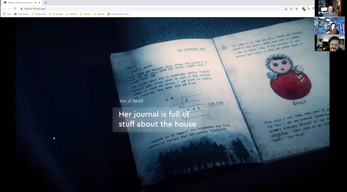 That was all it took for me and my team to be hooked once the game started. We were immediately immersed in Wolf Escape Games’ Hallows Hill. Once we were past the unusually detailed onboarding instructions (how to share video and sound if playing with remote partners), our screen shifted to a text conversation. It sounds like something prosaic, but the pacing, music, and tone were perfect. We were instantly intrigued. Even as a remote player watching my teammate do all the clicking, I was able to interact with important elements through the digital backpack, a web page I was able to open on my phone, and explore the clues from the game at my own pace.