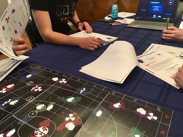 Various items laid out and our team puzzling.