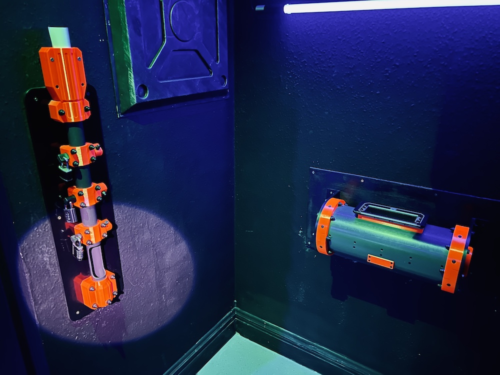 Black and orange 3D printed puzzle tubes mounted to a black wall.