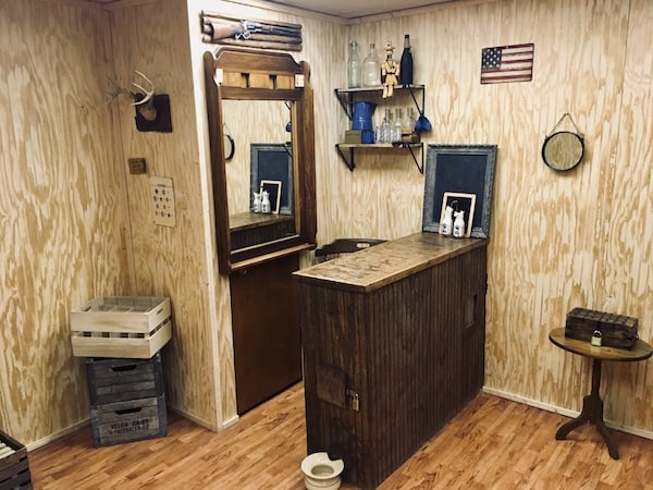 In-game: A bar top in a wooden room surrounded locked boxes.