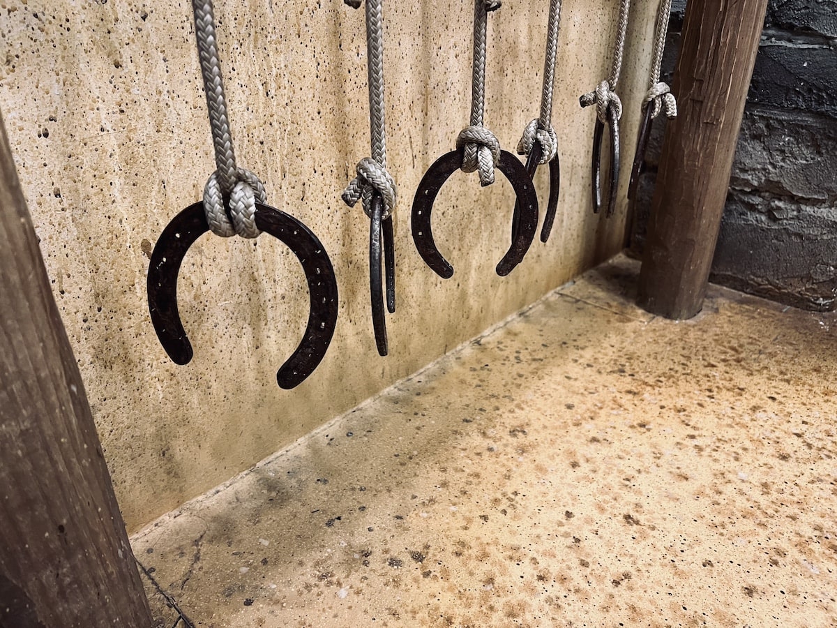 Closeup of horseshoes hung from a post.