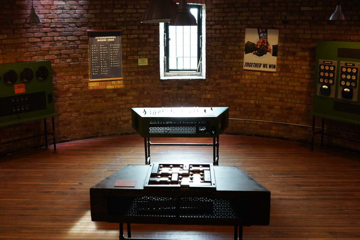 An assortment of puzzle stations and old technology in the turret of a tower.