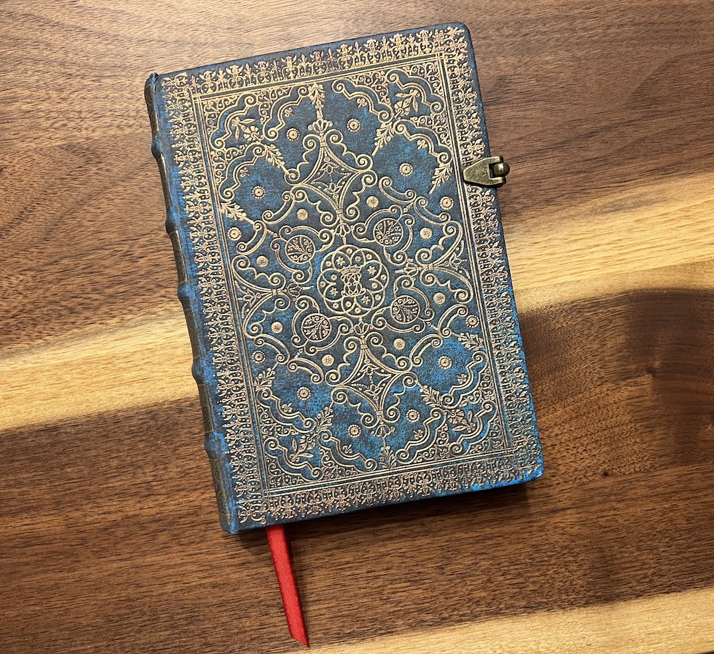 A blue notebook with an ornate gold pattern. It has a metal clasp, and a red ribbon bookmark.