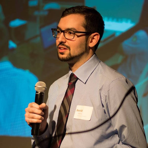 David holding a microphone and delivering a talk on a stage.