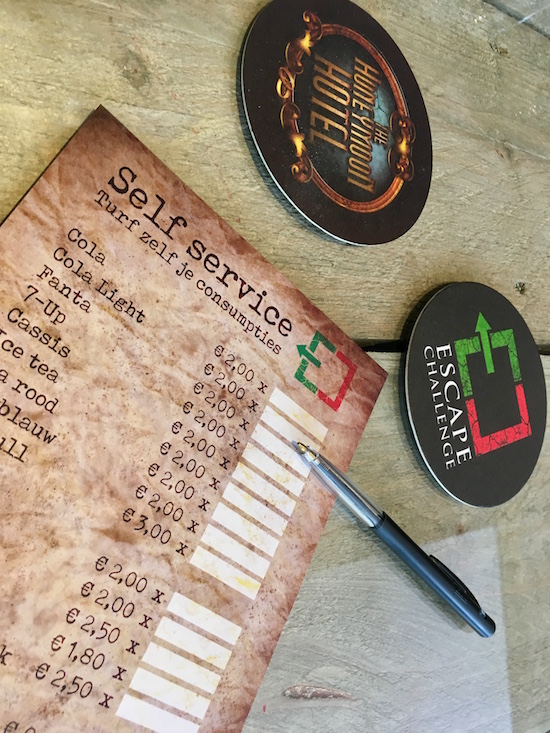 Escape Challenge's lobby self service food and drink price list/ form.