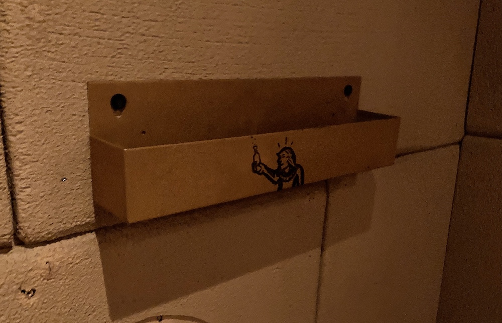 A metal trough attached to the wall to hold drinks in an escape room.