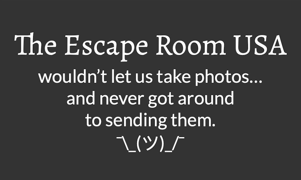 Grey background with white lettering reads, "The Escape Room USA wouldn't let us take photos... and never got around to sending them." The text finishes with a shrug emoticon.