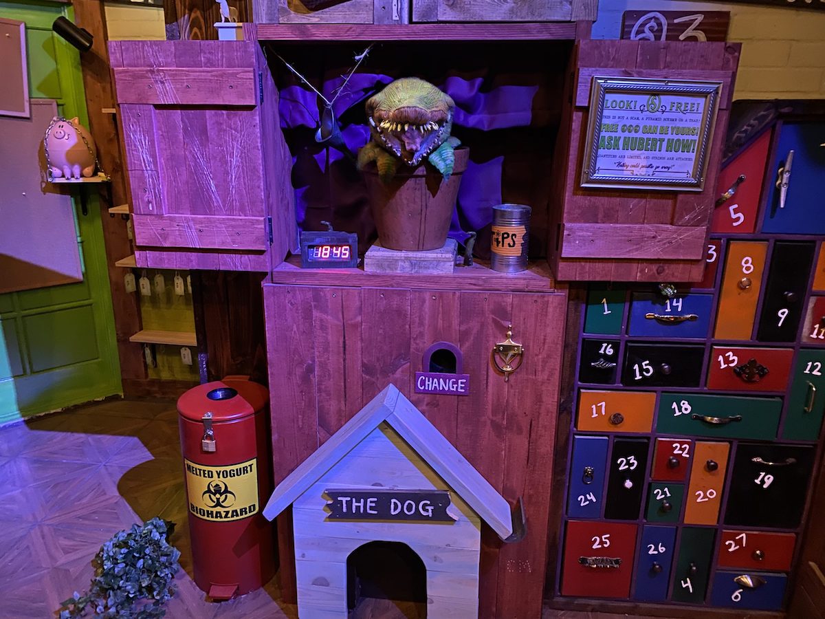 A venus flytrap puppet beside a strange chest of drawers, each with a different number.