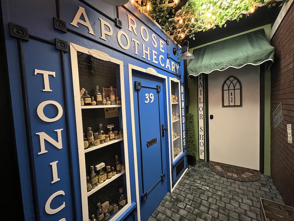 Blue and white store facade for "Rose Apothecary" with medications and tinctures in the window.