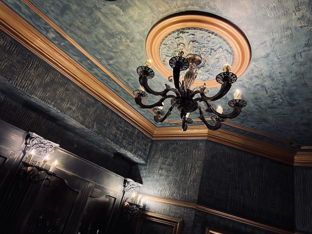 A beautifully painted blue ceiling with gold molding and accents, in the center is an elaborate chandelier.