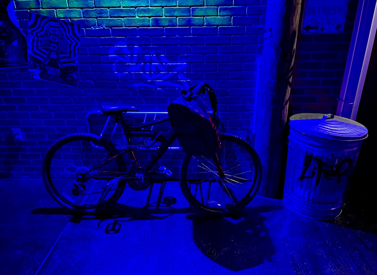 A bicycle with a backpack locked to a rack in a graphited alley.