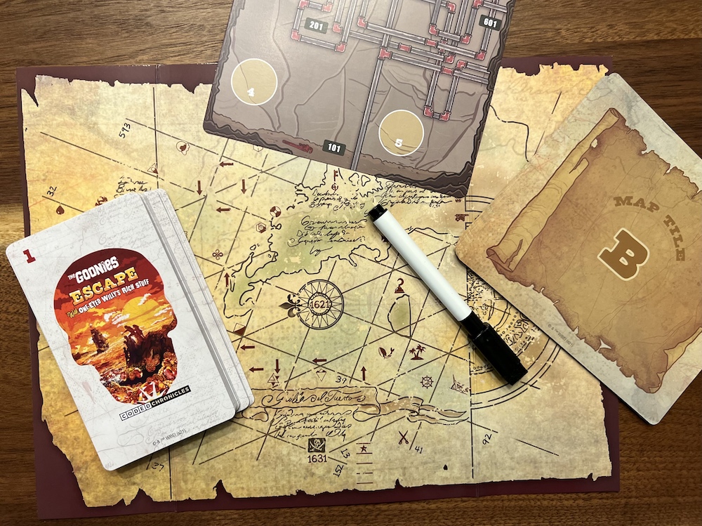 A map some puzzle cards, and a dry erase marker.