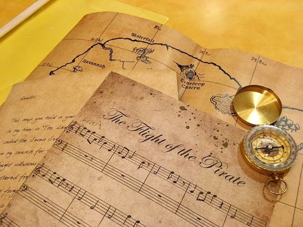 A letter, sheet music, a map, and compass.