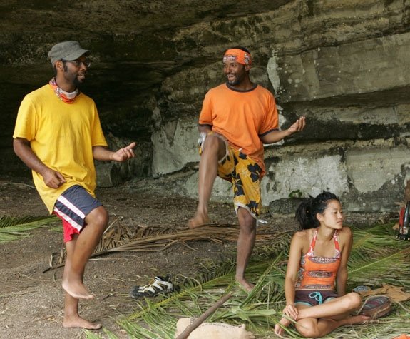 a woman sits on palm leaves on the ground while 2 men are dancing with their knees raised inside a cave.