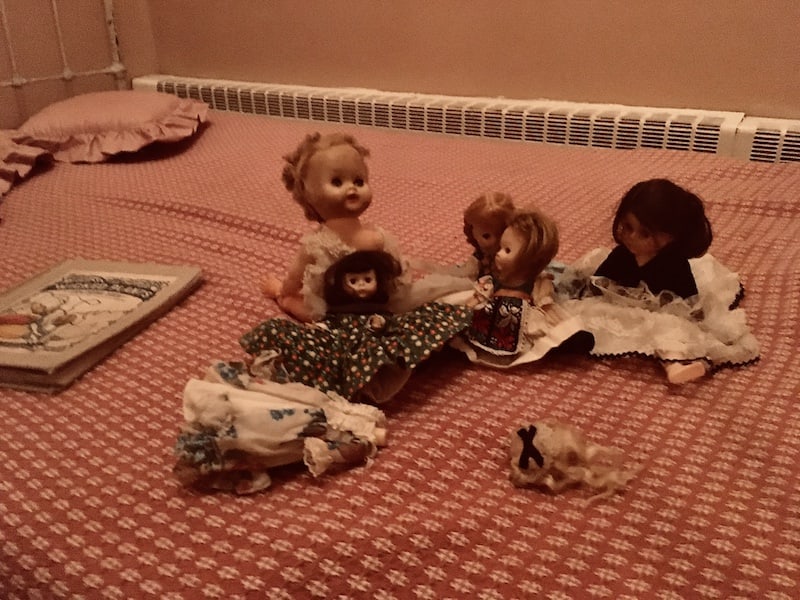 In-game: an assortment of partially dismembered dolls resting on a bed.