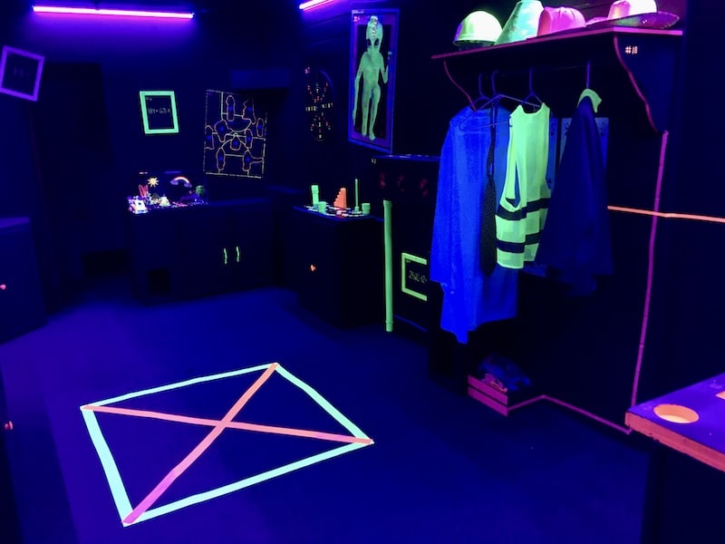 In-game: wide shot of Darklight Disco. There are an assortment of costumes hanging from the wall, and a glowing square on the floor.