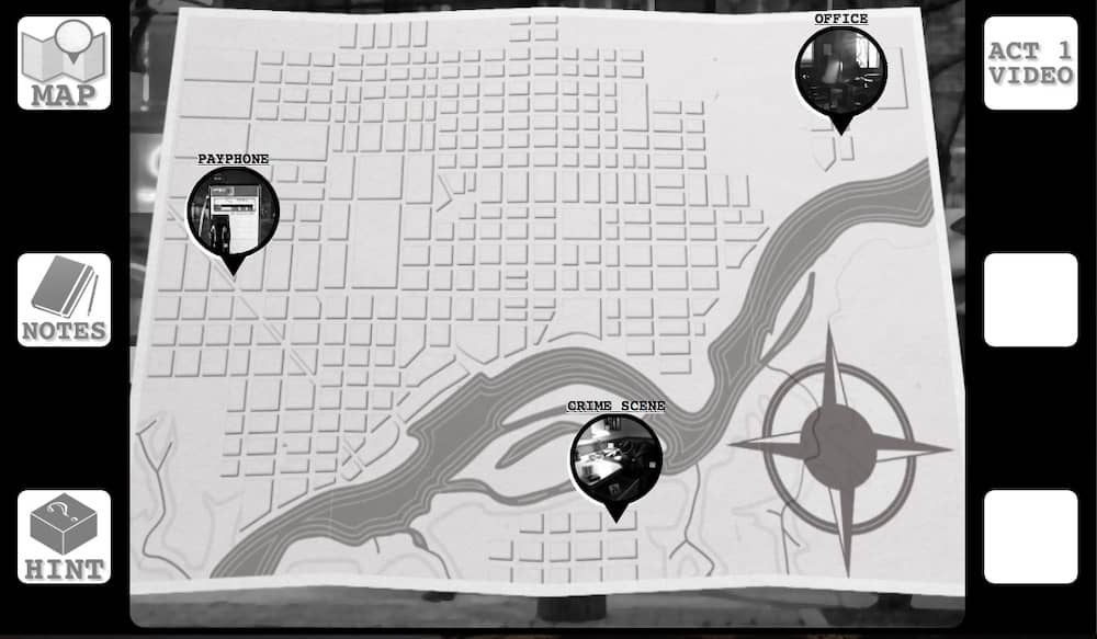 Black & white digital interface depicts a city mapy with places of interest that include, "Office," "Crime Scene," & "Payphone."