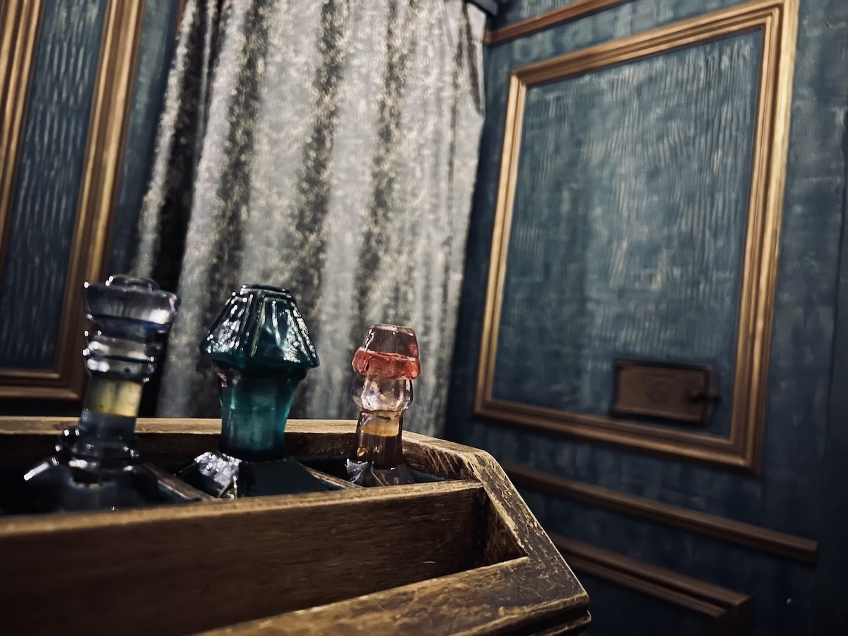 Closeup of perfumes in a box.
