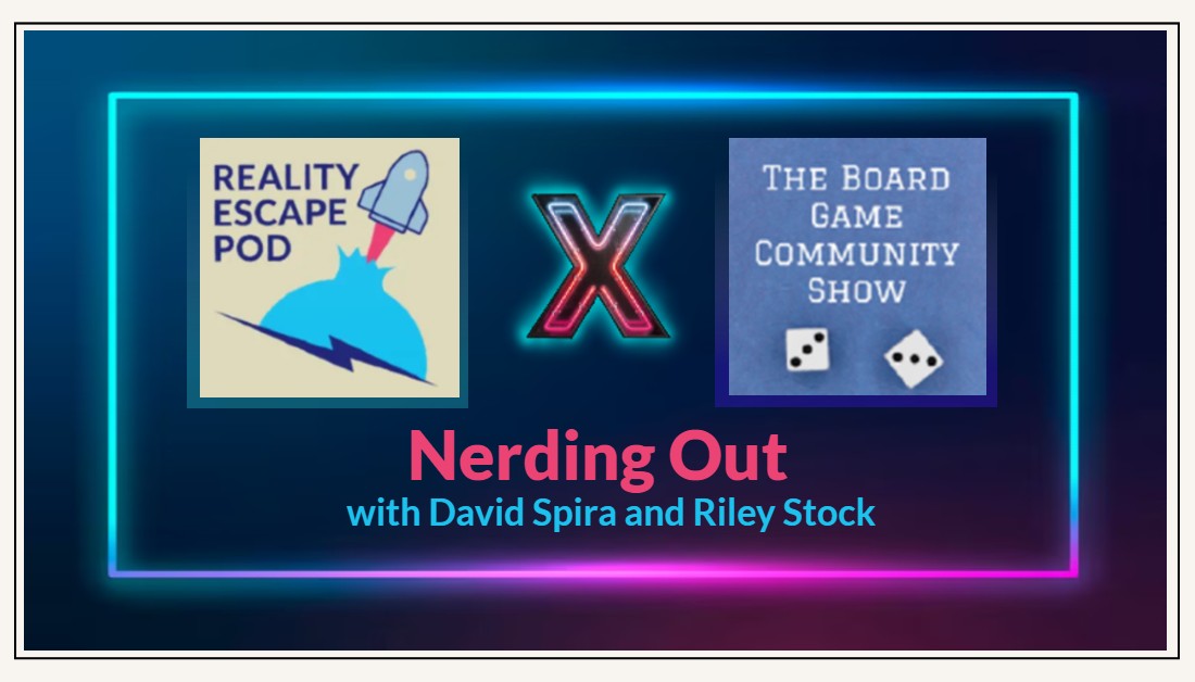dark background with a blue and purple neon frame. Inside are the logos for Reality Escape Pod with a rocket ship and The board game community show with 2 dice. Underneath it says "nerding out with David Spira and Riley Stock"