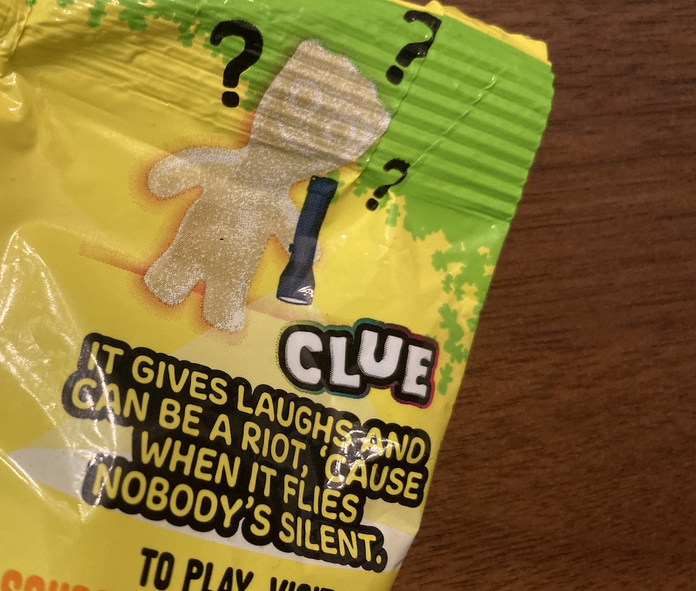 Clue rads, "It gives laughs and can be a riot, 'cause when it flies nobody's silent."