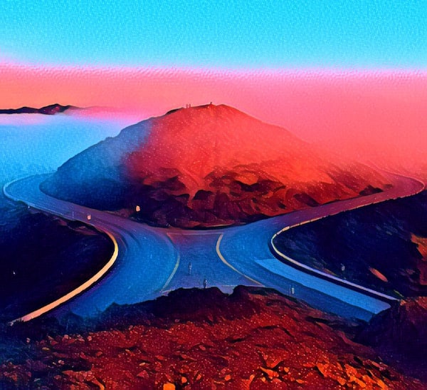 Stylized image of a road splitting around a mountain.